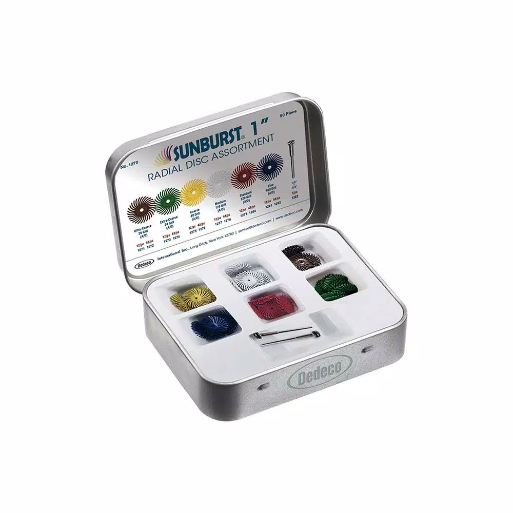 Dedeco SUNBURST RADIAL DISCS generate minimal dust and heat and eliminate the need for polishing compound. No matter what the material being worked, SUNBURST RADIAL DISCS are the absolute best for finishing and polishing hard-to-access areas without removing detail or causing flat spots. The sharp, clean, specially treated ceramic abrasive grain imbedded throughout their thin flexible bristles enable them to work faster and last-longer than rubber wheels, brushes, buffs and conventional sanders. Recommended operating speeds for most applications is 3,000 RPM to 18,000 RPM (5,000 RPM for wood working). Lower speeds allow a softer touch, greater flexibility and more subtle results. Higher speeds provide more aggressive material removal. Using the tips of the bristles with light pressure maximizes disc life.