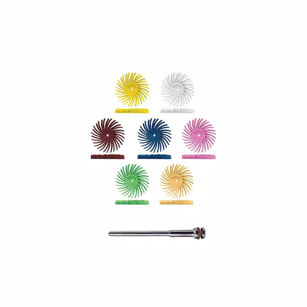 Dedeco SUNBURST RADIAL DISCS generate minimal dust and heat and eliminate the need for polishing compound. No matter what the material being worked, SUNBURST RADIAL DISCS are the absolute best for finishing and polishing hard-to-access areas without removing detail or causing flat spots. The sharp, clean, specially treated ceramic abrasive grain imbedded throughout their thin flexible bristles enable them to work faster and last-longer than rubber wheels, brushes, buffs and conventional sanders. Recommended operating speeds for most applications is 3,000 RPM to 18,000 RPM (5,000 RPM for woodworking). Lower speeds allow a softer touch, greater flexibility and more subtle results. Higher speeds provide more aggressive material removal. Using the tips of the bristles with light pressure maximizes disc life.