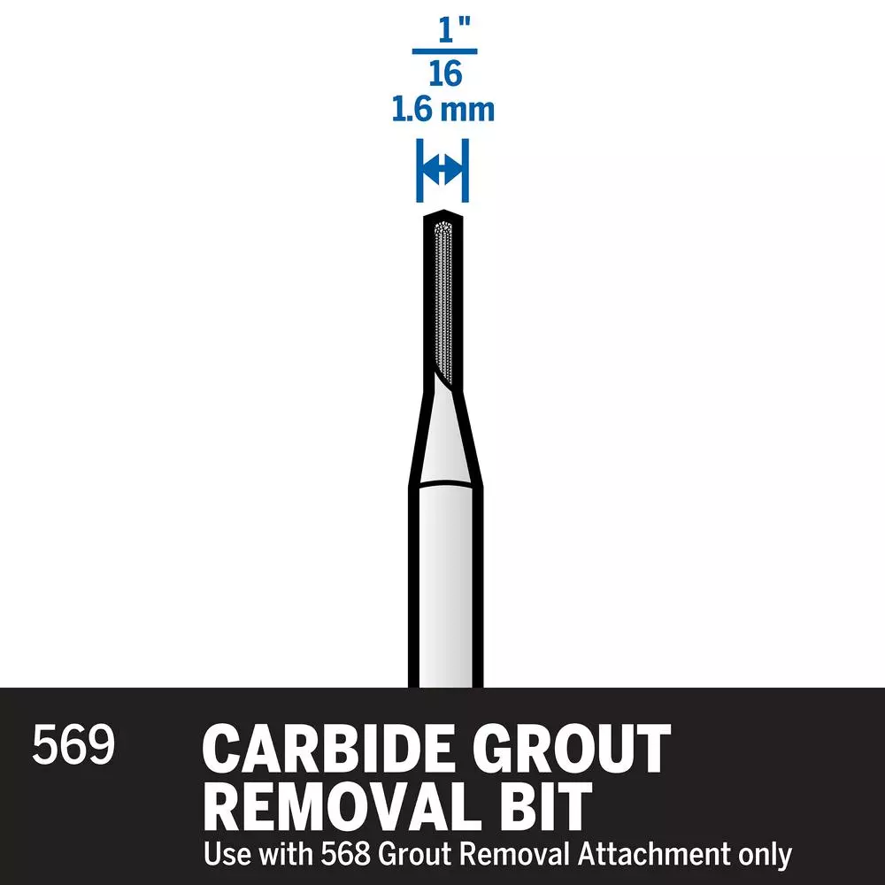 Simplify your grout-extraction chores with this 1/16 in. Carbide Grout Removal Bit. When used in conjunction with the separately sold Dremel Grout Removal Attachment (model 568), it precisely pulverizes old grout behind the power of a rotary tool. When the grout bordering your wall or floor tile runs its course or becomes permanently soiled, let this heavy-duty carbide bit remove it with ease.