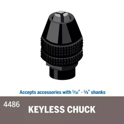 A desirable companion for any applications that require frequent accessory changes, the Dremel 1/32 in. Multi-Pro Tool Chuck can be a handy supplement to your tool collection. Skip collet changes and swap out attachments on the fly with this tool chuck, which can house most 1/32 in. to 1/8 in. shank bits.