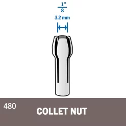 A slim, aluminum tube that provides the optimal grip for holding a bit in a Dremel rotary tool. Dremel 480 1/8 in. collet for models 245, 250, series 3 and later, 260, 270, 280, series 2 and later, 275, 285, 370, 380, 395, 595, 850, 750, 232, 332, 241, 246, 277 and 8504, number 225 and 90199 flex shaft attachments and hand piece 235 and 237. Collets work with the collet nut (threaded) to hold the accessory in the end of the tool.