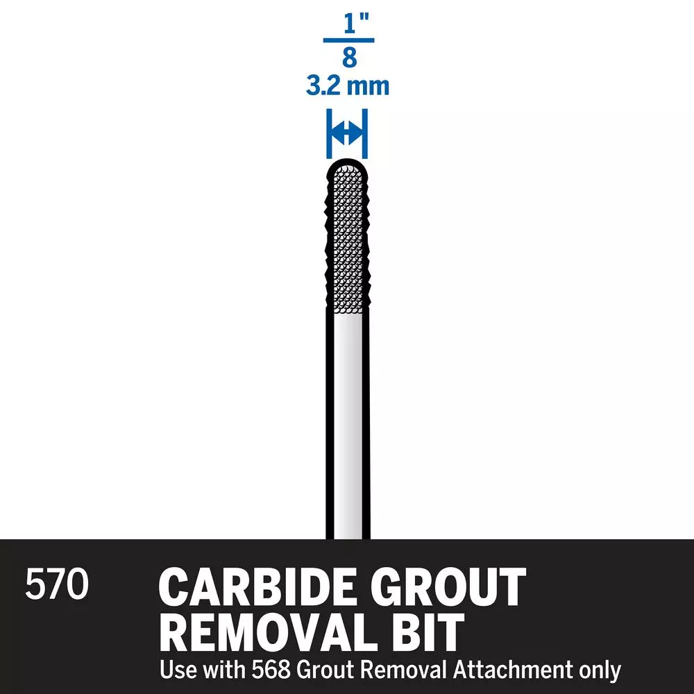 The Dremel 570 1/8- in. Carbide Grout Removal Bit is ideal for replacing wall and floor grout or removing grout to replace broken tiles. This bit removes wall and floor grout 3/8- in. below the face surface without damaging floor tiles.