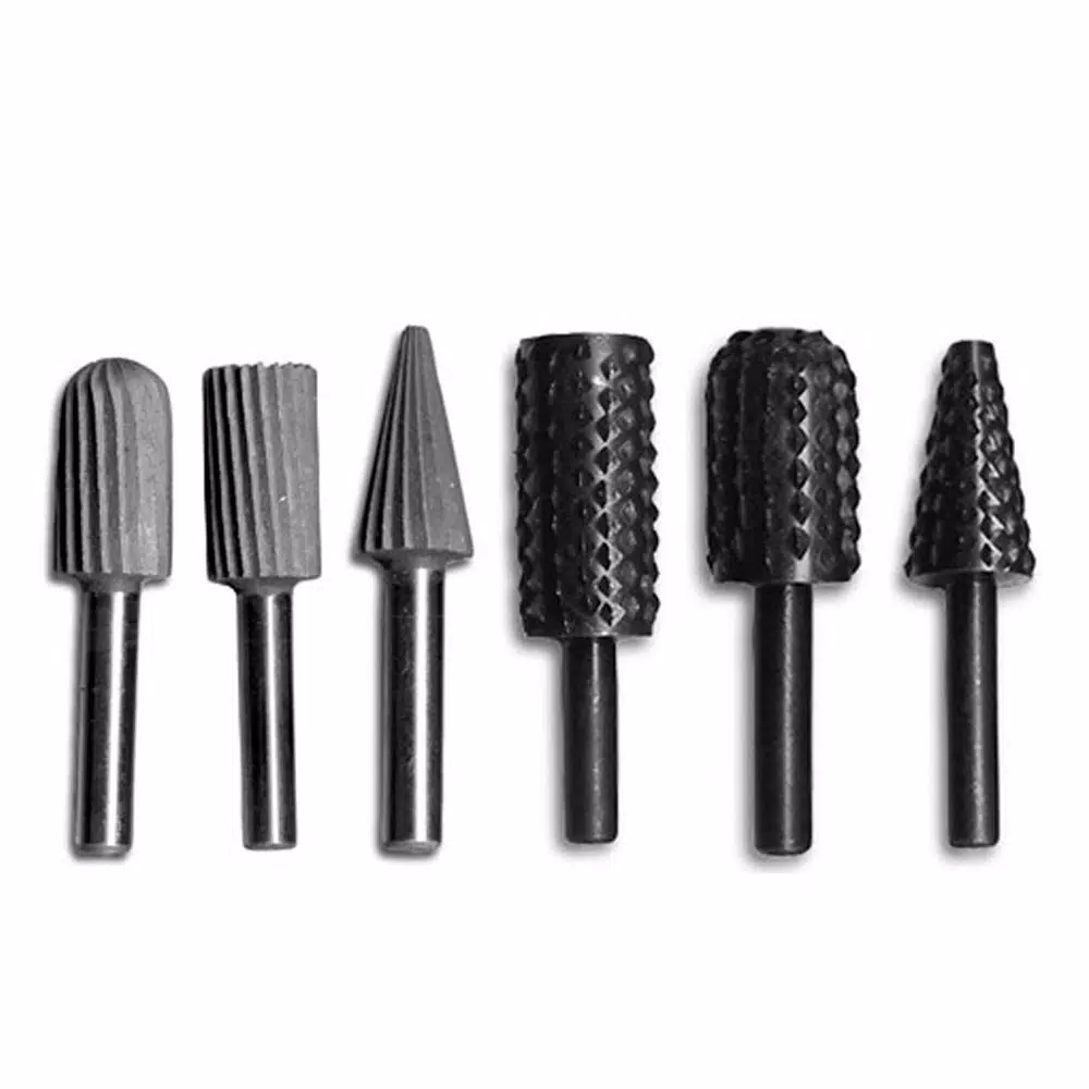6-Pieces Rotary File and Rasp Asst., 1/4 in. shank 1/4 in.(6.4 mm), hardened Alloy steel for wood and soft metals. Contains 1 rounded edge, 1 square edge, 1 pear shaped edge, 1 tapered rotary file (carded), and 1 beveled pointed rotary file(carded). Hardened alloy steel allows for durability and longevity.