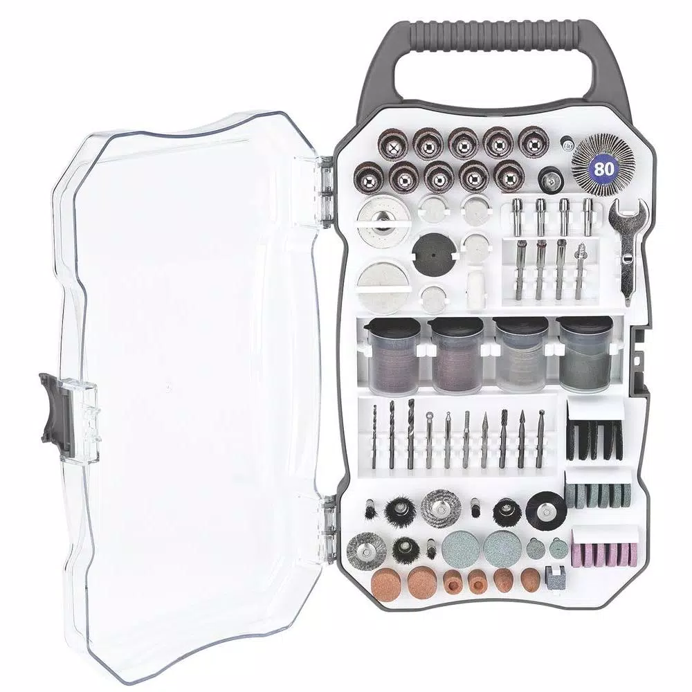 - Comprehensive kit includes cut-off disks, flap wheels, felt disks, diamond burrs and drills, wire brushes, sanding wheels, grindstones and more
