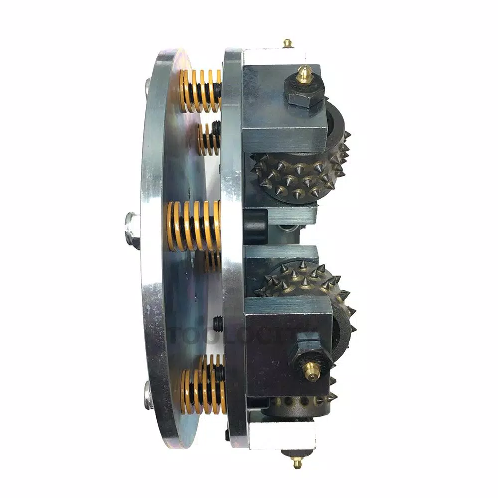 This 10 in. bush hammer tool can be used with floor machines for bush hammering of concrete floors and surfaces. They have 6 rollers with 1 in. center bore size for appropriate floor grinding machines. The Roughness of the bush hammered surface can be adjusted with our bush hammer through adjustment of spring elasticity on the bush hammer or through the pressure of the manual grinding machine. Loosening spring elasticity or lessening pressure with increased roughness of hammering will result and tightening the springs or increasing machine pressure will reduce roughness to give the bush hammered surface a finer look.