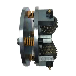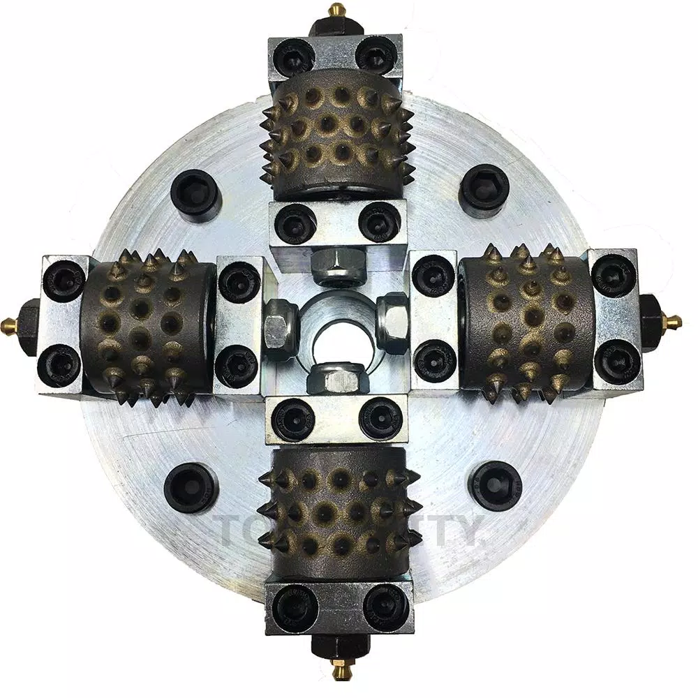 This 8 in. bush hammer tool can be used with floor machines for bush hammering of concrete floors and surfaces. They have 4 rollers with 1 in. center bore size for appropriate floor grinding machines. Roughness of the bush hammered surface can be adjusted with our bush hammer through adjustment of spring elasticity on the bush hammer or through the pressure of the manual grinding machine. Loosening spring elasticity or lessening pressure with increased roughness of hammering will result and tightening the springs or increasing machine pressure will reduce roughness to give the bush hammered surface a finer look.