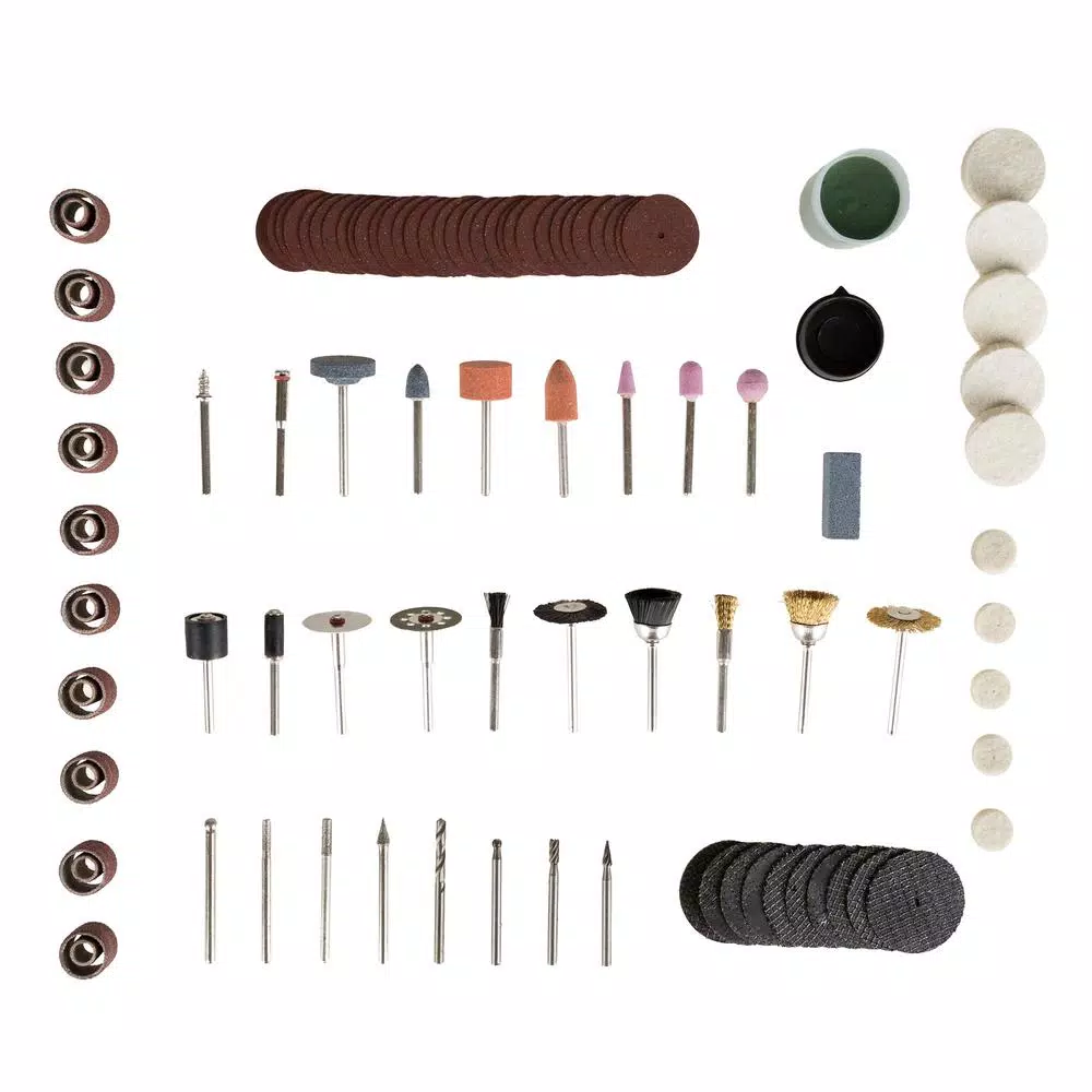 - Includes: 1 – mandrel for felt wheels 7 – grinding stones 4 – diamond wheel points 1 – drill bit 3 – HSS cutters 2 – mandrels for sanding bands 1 – diamond cut-off wheel with shank 1 – stainless cut-off disc with shank 3 – nylon brushes 3 – brass brushes 20 – sanding bands 1 – polishing compound 1 – whet stone 10 – fiberglass cut-off wheels 31 – cut-off wheels 10 – felt wheels