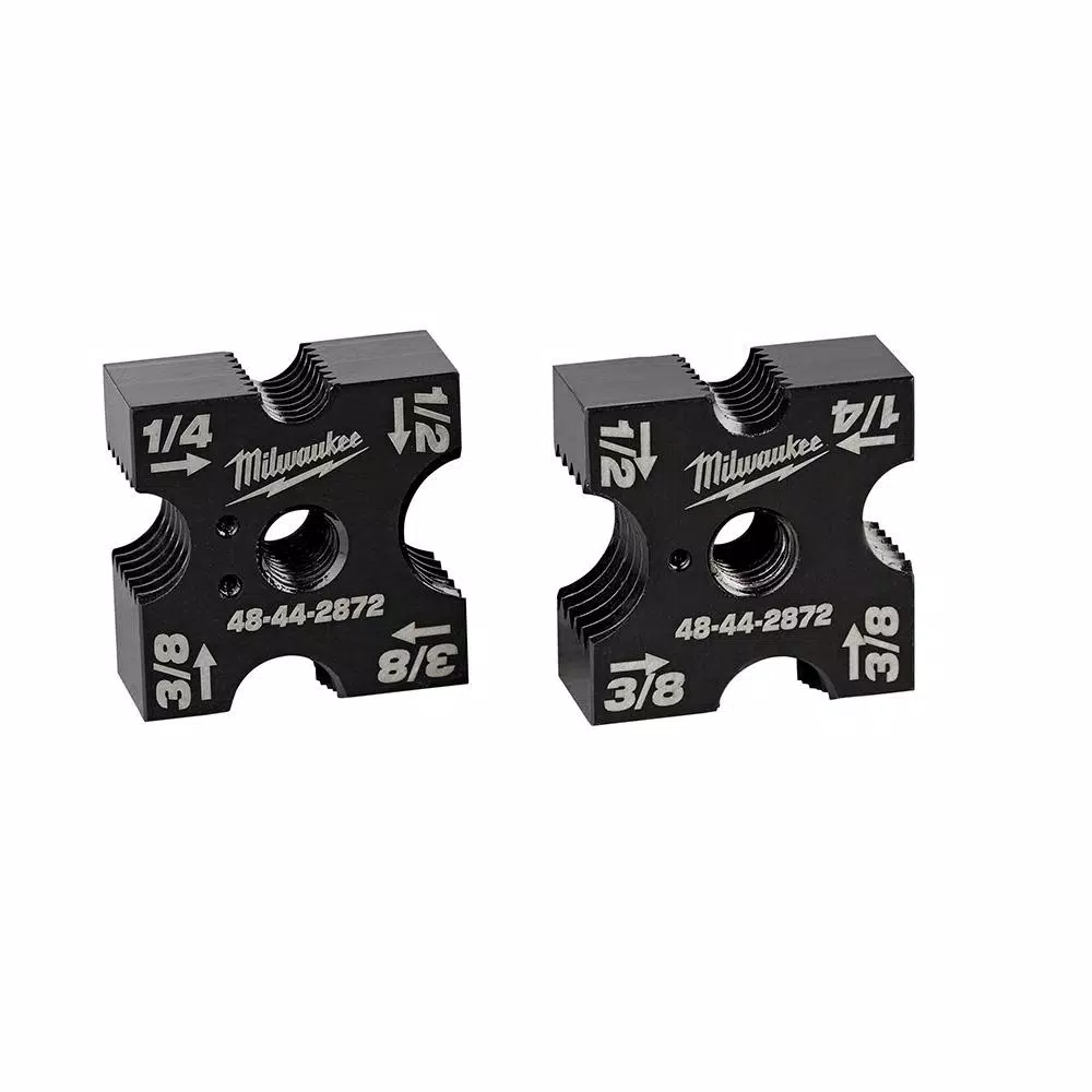The Milwaukee Multi-Size 1/4, 3/8 and 1/2 Replacement Threaded Rod Cutting Die Set was designed to produce clean, burr-free cuts. The superior blade geometry effortlessly cuts through 1/4 in., 3/8 in., 1/2 in. mild steel and 1/4 in., 3/8 in. stainless steel coarse threaded rod, without creating chips or sparks. The 4-sided rotatable threaded rod cutter dies allow users to cut all three sizes of threaded rod with the same tool. Size markings are clearly indicated on all thread cutter dies as well as markings for upper and lower jaw placement. The replacement dies are compatible with the Milwaukee M18 Brushless Threaded Rod Cutter (2872-20) and M18 Brushless Threaded Rod Cutter Kit (2872-21).