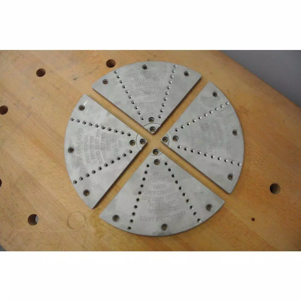 NOVA 6040 Large Cole Jaw Set has 12 in./304mm bowl diameter capacity. This is one of the most popular of all the NOVA chuck accessory jaws and is now in a new larger size of 12 in.es. Its an accessory for NOVA Chucks, designed to expand your range and capacity of your standard NOVA Chuck for specific projects and applications. Universally fits to any NOVA Chuck for maximum flexibility. This Large Cole Jaw Set is versatile, designed for the re-chucking of bowls to remove chuck marks, adding decoration or reshaping the bottoms of bowls that have already been turned. Other NOVA Accessory jaw sets can be added to the Cole Jaws making a combination jaw facility – expanding dovetail facility for mounting bowls/platters and a reverse dovetail for mounting footed bowls/platters. These jaws have many advantages over traditional vacuum chucking. Suitable for lathes with a minimum 12 in. swing diameter. Diecast aluminium with preset holes, for precise closing, durability and long life. Comes with 4 jaw segments, special fasteners, standard rubber bumpers and instructions. Additional accessory bumpers are available. This set has a unique feature which enables you to add a NOVA Cole Jaw Extension Kit 6039 and take the capacity from up to 12 in./304mm through to 15 in./381mm (additional purchase).