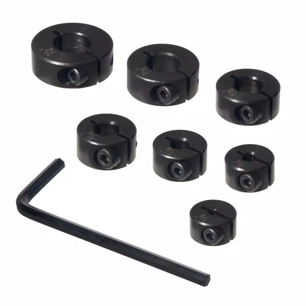 - Includes: 7-piece split ring stop collar set (assorted sizes) and (1) Allen wrench to tighten stops