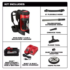 - Included: (1) 0885-20 M18 FUEL 3-in-1 backpack vacuum, (1) M18 REDLITHIUM High Output 8.0 Ah battery pack, (1) M18 & M12 rapid charger, (1) HEPA filter, (1) flexible hose, (1) telescoping extension wand, (1) floor tool, (1) crevice tool, (1) dust extraction adapter
