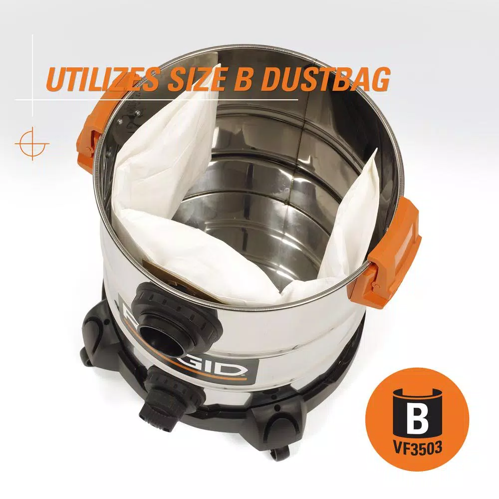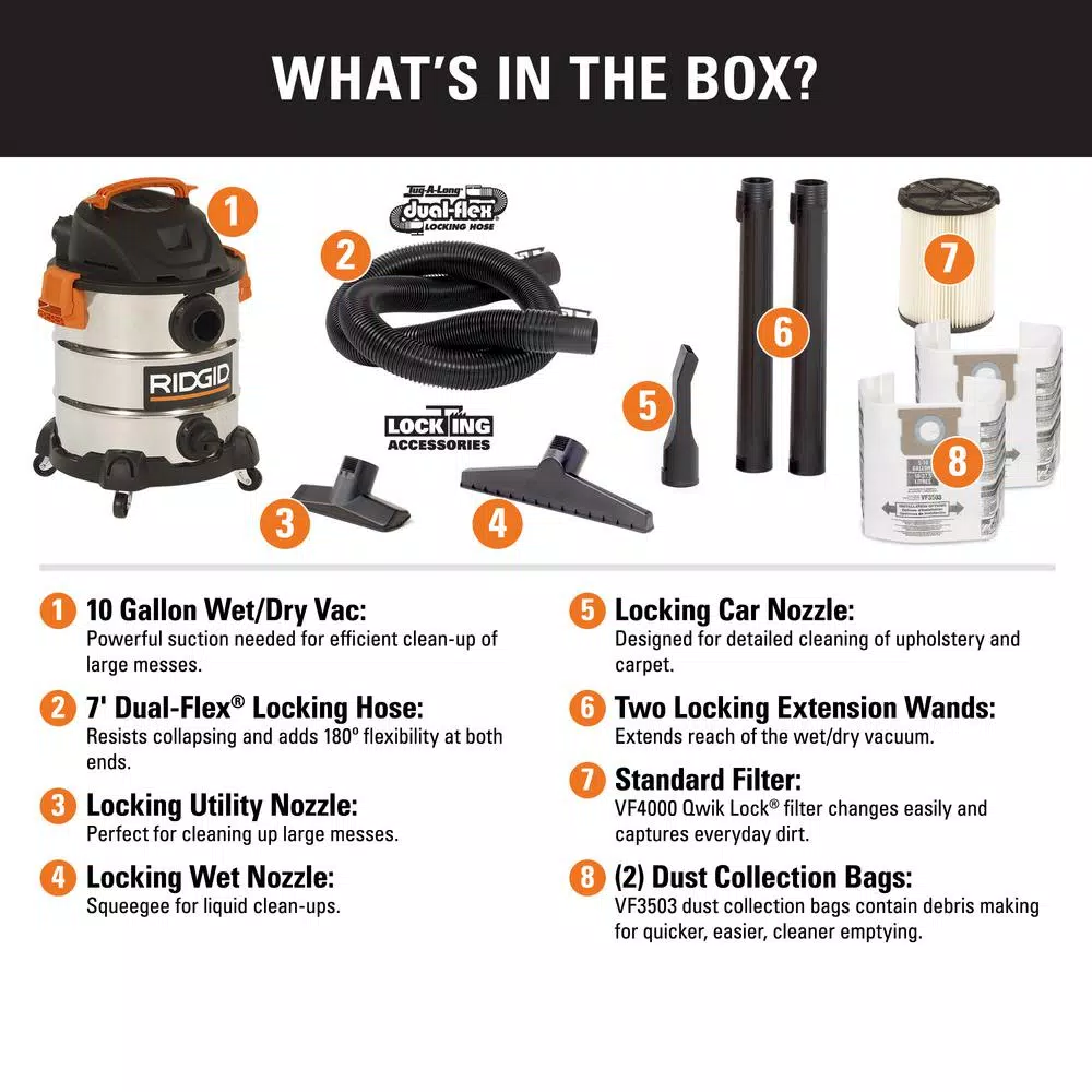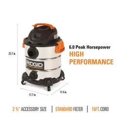 This RIDGID 10 Gal. stainless steel wet dry vacuum is designed to deliver high performance through its 6.0 peak HP motor that easily handles tough clean-up tasks. Add a top handle with a cord wrap, stainless steel drum construction and caster feet with accessory storage and you have a wet/dry vacuum that meets the demands of Pros, DIYers and homeowners. It features the Patented Qwik Lock Filter Fastening System that makes installing or removing your filter quick, easy and secure. Includes 2 bonus dust collection bags to ensure your mess stays contained when you’re emptying your vac.