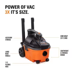 This 4 Gal. wet dry vac has a 5.0-peak horsepower motor that offers the powerful performance necessary to tackle even the messiest projects. The 20 ft. cord provides an extensive reach and the 18 lbs. design is light-weight and easily portable. The wet/dry vacuum’s large rear wheels and casters provide great mobility over carpeted floors, thresholds and rough floors at jobsites. Including auto-detailing kit.