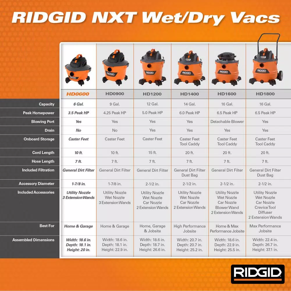 Part of the most powerful line of wet dry vacs RIDGID has ever made, the RIDGID 6 Gal. NXT wet/dry vac is sleeker than ever and was designed as a modern vac on the outside with amped-up power and performance on the inside. This vac has a 3.5 peak horsepower motor great for everyday cleanup of small-volume dirt and debris. Its compact design requires minimal storage space in a garage or on a truck and was built for easy lifting and comfortable transport with an ergonomic front-to-back top carry handle and comfort grip drum carry handles. For added versatility, connect the hose to the blower port and use for blowing leaves, grass clippings and more. It features the patented Qwik Lock Filter Fastening System that makes installing or removing your filter quick, easy and secure. Replacement filter VF4000 and Size C – VF3501 Dust Collection Bags sold separately.
