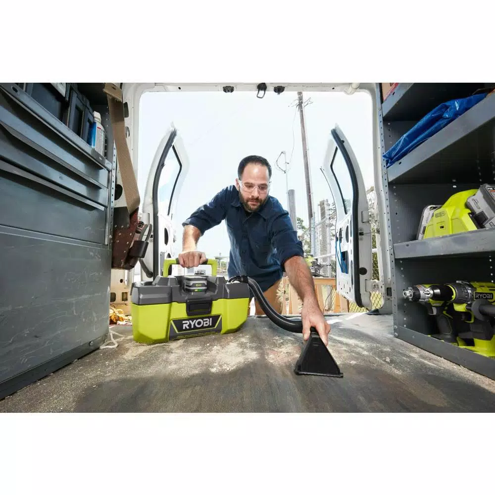 RYOBI introduces the 18-Volt ONE+ 3 Gal. Project Wet/Dry Vacuum with Accessory Storage. Equipped with both wet and dry capability, this vacuum has 3 Gal. of dry debris capacity. This versatile vacuum doubles as a directional blower and includes a utility accessory that attaches directly to the exhaust output for a quick and easy change from vacuum to blower. The 6 ft. x 1-1/4 in. extendable hose is transparent, giving you optimal visibility of debris as it is vacuumed, and the pivoting air inlet port makes for easy hose management. The Project Vacuum has a Flat-top design for convenient stacking and storage. The 18-Volt ONE+ 4.0 Ah LITHIUM+ HP Battery provides superior runtime, power, and performance, this battery can take on more demanding applications than ever before with the introduction of HP Technology. HP Technology communicates with brushless tools to maximize performance in all applications, allowing users to make faster cuts, drive larger screws, utilize bigger drill bits, and more. It has a durably constructed frame for impact protection and has a built-in 4-bar illuminated charge indicator. Best of all, it is part of the RYOBI ONE+ System of over 175 Cordless Tools that all work on the same battery platform. Backed by the RYOBI 3-Year Manufacturer’s Warranty, the 3 Gal Project Wet/Dry Vacuum includes onboard storage for the included washable filter, crevice tool, utility nozzle, hose, and operator’s manual. Battery and charger sold separately.