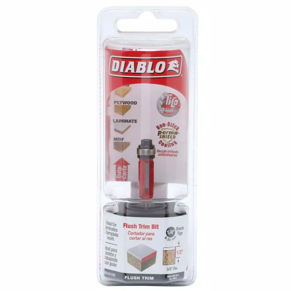The Diablo 3/8 in. x 1/2 in. Carbide Flush Trimming Router Bit has a bottom bearing that travels along the edge of a template to guide your tool down an identical cutting path. Ideal for making copies of a master workpiece, it provides a controlled, splinter-free trim on all types of wood and laminates. The high-density carbide and titanium composition stands up to repeated use and is designed to produce clean, safe cuts every time.