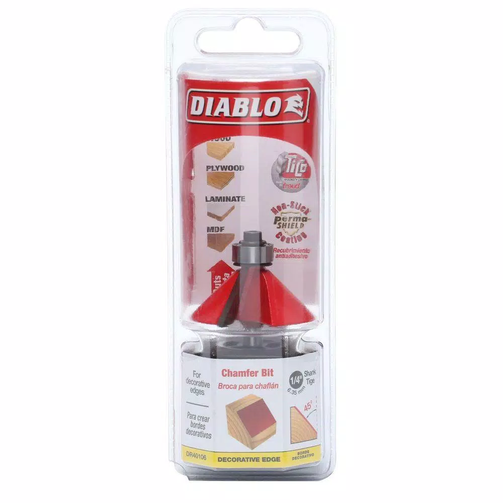 Take your woodworking repertoire to the next level with the Diablo Chamfer 45-degree Carbide Router Bit. It’s outfitted with a bottom bearing that glides along your workpiece to produce clean, sharp angled edges every time. The solid carbide construction stands up to heavy-duty use and withstands high temperatures to produce controlled, safe cuts.