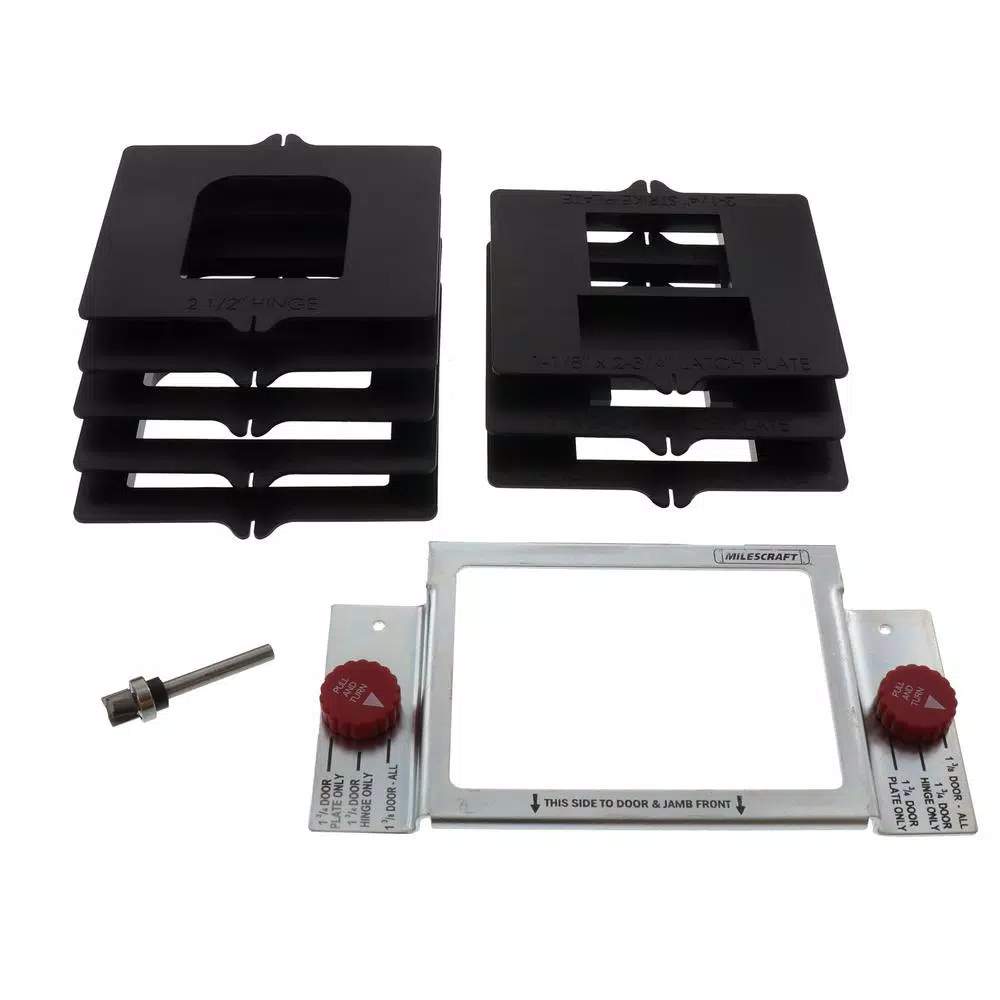 Rout matching mortises for hinges, strike plates and latch plates into your door and jamb with the Milescraft Complete Door Mortising Kit for Routers. It enables you to accurately hang a new or replacement door with minimal extra work. This kit includes an easy drop-in template design and everything you need for most hinges, strike plates and latch plates for 1-3/4 in. and 1-3/8 in. thick wood doors.
