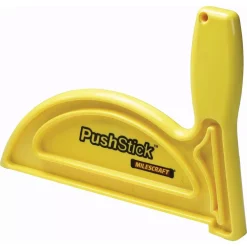 Unique safety-first push stick keeps hands an extra distance from blades and bits. Extra tall push stick handle is tilted inward, away from blade or bit location. Operator’s hand is automatically moved further from potential danger.