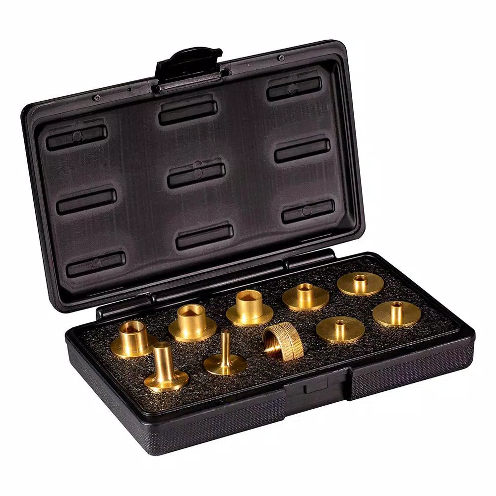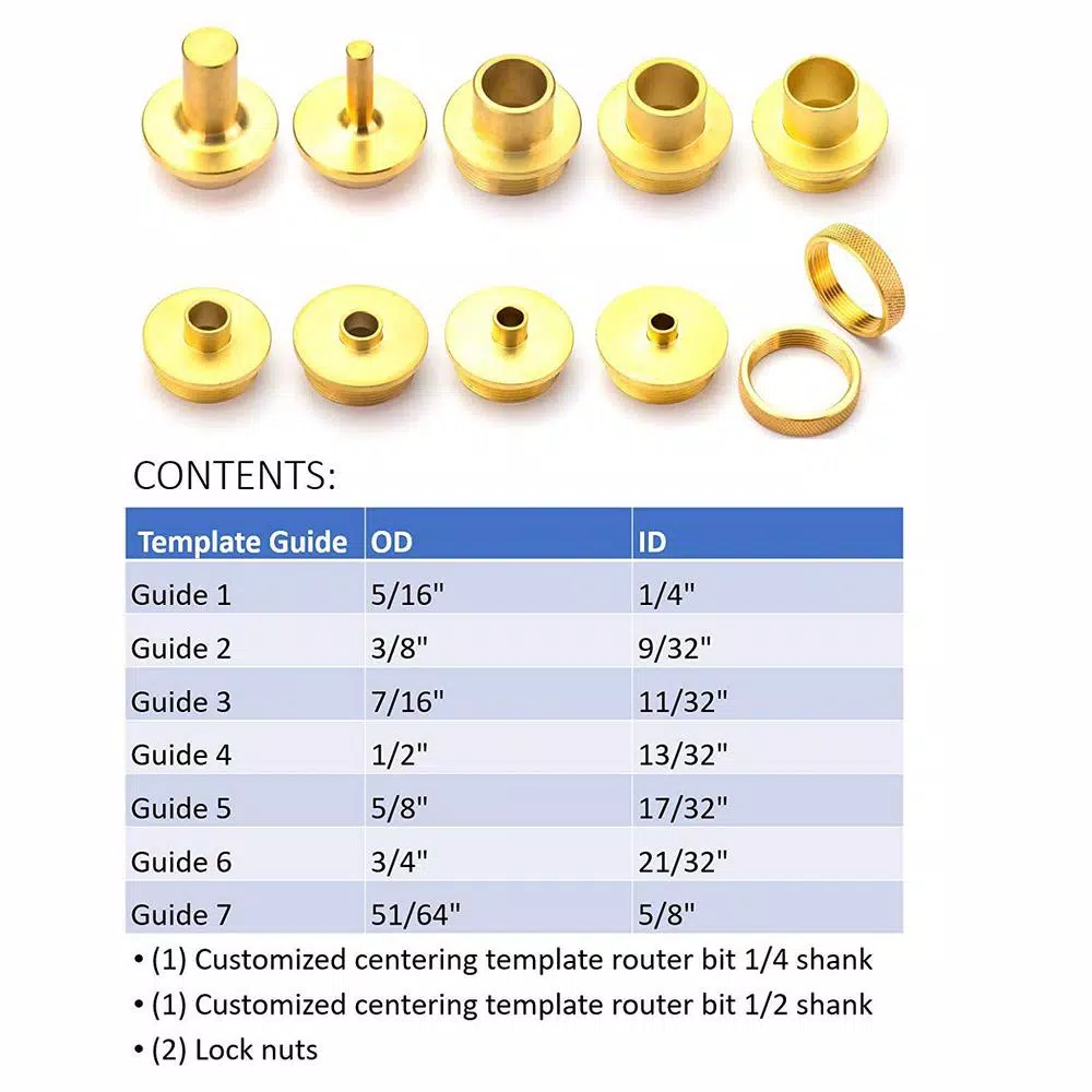 Introducing the Brass Router Template Guide Set by POWERTEC. This premium router bushing set features an assortment of template guide sizes and accessories that function with a variety of template routing applications. Unlike some kits that require special base plates or come with a mix of plastic and steel templates, our router guide set is constructed of high quality brass, providing consistent results, while eliminating the worry of potential damage to your router bits A Versatile Set of Bushings for Any Router: This router template guide set was not only packaged with affordability in mind, but designed for optimal utility for all skill levels. Its versatility is highlighted when used for pattern and hinge routing, dovetailing or DIY craft woodworking projects. These bushings fit all routers are extremely easy to use and come with everything you need to secure a perfect fit. They will fit any 1-3/16 inch or 1-1/4 in. base plate and are compatible with most popular brands, including Bosch, Porter Cable, Makita, Dewalt and more. Type: Guide Bushing CONTENTS: Template Guides1/4 in. (ID) x 5/16 in. (OD)9/32 in. (ID) x 3/8 in. (OD)11/32 in. (ID) x 7/16 in. (OD)13/32 in. (ID) x 1/2 in. (OD)17/32 in. (ID) x 5/8 in. (OD)21/32 in. (ID) x 3/4 in. (OD)5/8 in. (ID) x 51/64 in. (OD) (1) Customized centering template router bit 1/4 shank/(1) Customized centering template router bit 1/2 shank/(2) Lock nuts.