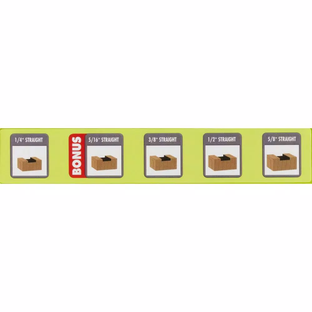 - Includes: 1/4 in., 3/8 in., 1/2 in., 5/8 in. straight router bits with a bonus 5/16 in. bit