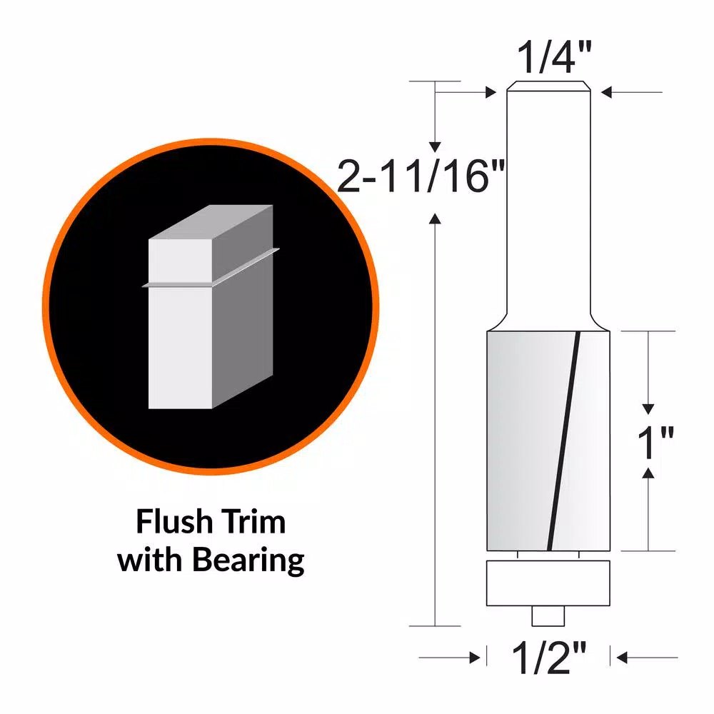 Remember when your bits could handle the toughest materials. Add some shape into your edges with the WEN Professional-Grade High Speed Steel Carbide-Tipped Router Bit series. These reliable and durable heat-treated bits feature extremely sharp tungsten carbide blades that slice through even the toughest of woods. Our flush trim profile combined with the onboard bearing help replicate complex edges and make flush surfaces in your workpieces. Features a 1/2 in. Dia, a 1 in. cutting length, a 2-11/16 in. overall length, a 1/4 in. Dia shank and a maximum RPM of 24000. And if this bit doesn’t cut it, check out the rest of our line of professional router bits, available in a wide variety of profiles and sizes. With WEN by your side, any job is within reach; from surface trimming to unique cabinetry, simple dados to decorative edges, you’ll be able to handle it all. Remember when you stepped your carpentry up a notch. Remember WEN.