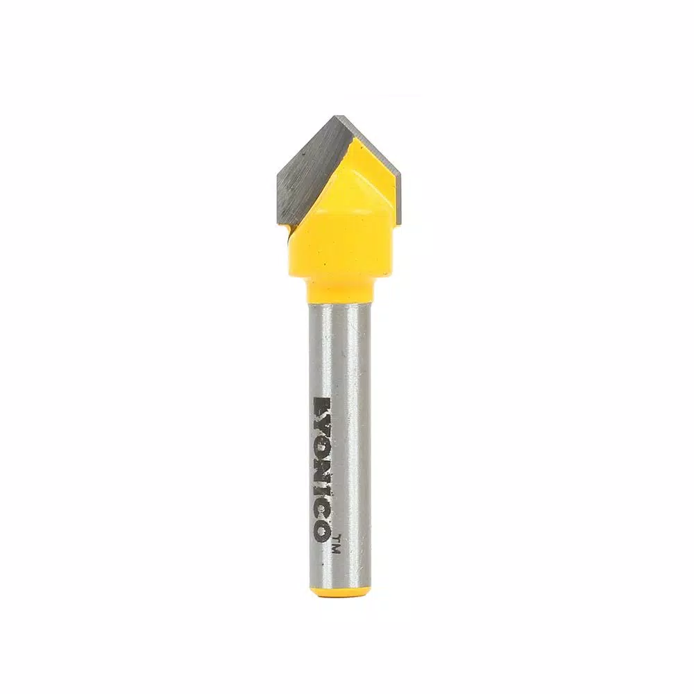 Use the Yonico 14988q 90° V-groove Router Bit for grooving, lettering and beveling. 2-flute carbide cutters and 1/24 in. shank. Grooving router bits are great for plunge routing in solid woods and MDF with a handheld router or CNC machine. Add an interesting detail to panels or use a template to trace a design with 1 of these profiles. V-groove router bits are also great for lettering and sign making.